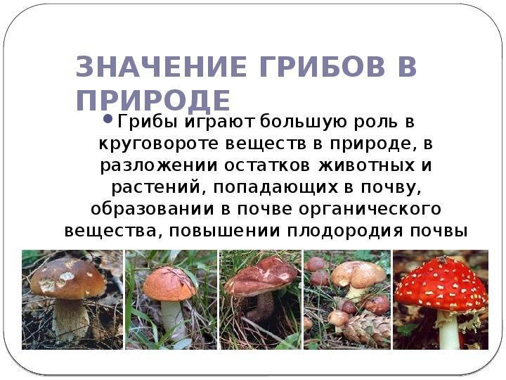 Роль грибов в природе велика. Поселяясь на органических остатках, грибы превращают сложные соединения в простые, включают их в круговорот веществ и повышают плодородие почвы.