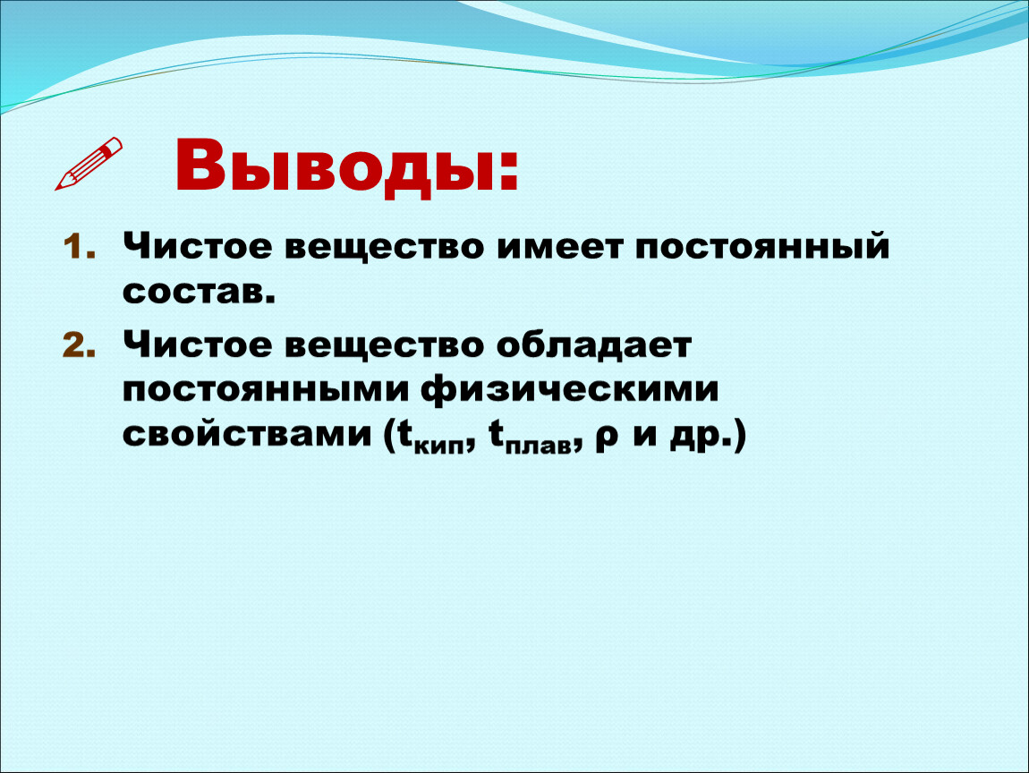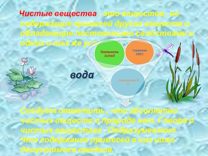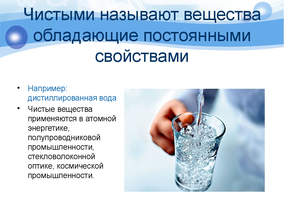 Это такое вещество, которое в своем составе имеет частицы только одного вида. Оказывается, оно имеет особенные свойства. У него есть еще одно название: индивидуальное вещество. Давайте попробуем охарактеризовать свойства чистой воды: