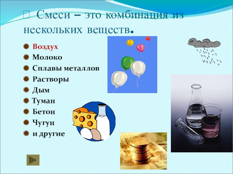 У особо догадливых ребят, возможно, уже возник вопрос: «Что чаще встречается – чистые вещества или смеси?» Отвечаем на ваш вопрос: «В основном все, что нас окружает – это смеси».
