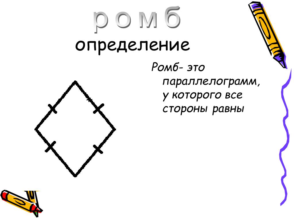 Говоря об определении РОМБА, не лишним будет тогда сказать и что такое параллелограмм, раз он там фигурирует.