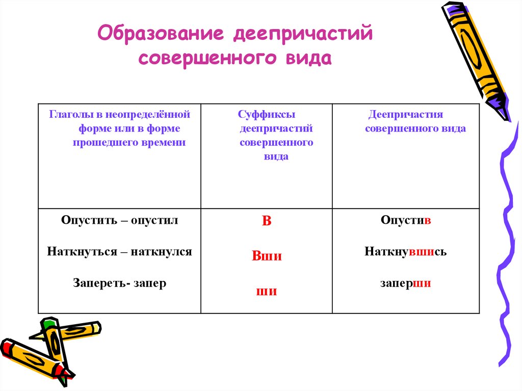 Деепричастия глаголов совершенного вида образуются от основы прошедшего времени присоединением суффикса -в (-вши, -ши). Суффиксы -в и -вши употребляются при образовании деепричастий от основ на гласный: с помощью суффикса -в образуют деепричастия глаголы без постфикса -ся (встретить — встретив, сбежать — сбежав); посредством суффикса -вши образуют деепричастия глаголы с постфиксом -ся (прикоснуться — прикоснувшись, подняться — поднявшись).