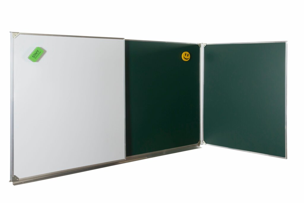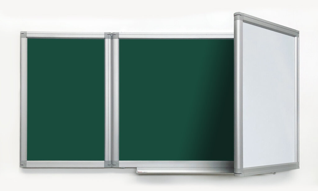 ознакомиться с досками школьными.Школьные доски подразделяются по числу рабочих поверхностностей и бывают одноэлементными (одна рабочая поверхность), двухэлементными, трехэлементными и пятиэлементными. Центральная часть аудиторной доски, которая крепится к стене, — это 1-й элемент, а 2-й и 3-й элементы могут независимо открываться и закрываться от плоскости центральной части доски до плоскости стены.