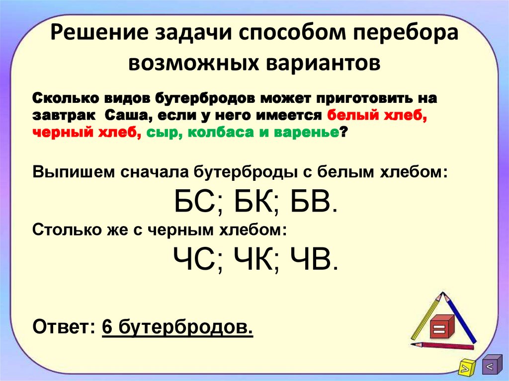 3. Решение задач методом полного перебора на доске и в тетрадях. (Приложение 1, слайд 5)