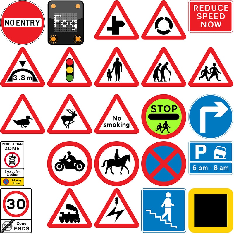 В этом PDF-документе можно посмотреть перечень дорожных знаков, используемых в Великобритании.