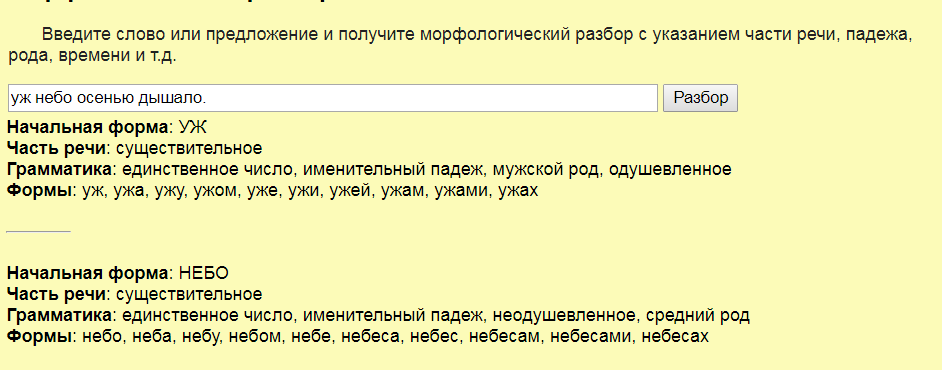 Нас интересует часть речи. Но будьте внимательны сервис недостаточно умен, чтобы всегда корректно его определить. Например, частица «уж». В приведенном предложении это частица, а никакое не существительное «уж». Про ужей тут речи не идет. Так что результаты пословного разбора предложения надо перепроверять вручную. В этом смысле он ничуть не выигрывает у сервисов, где вводится одно слово. Если б он мог из контекста определить значение, то выигрывал бы, а так – нет. Так что обратите внимание обычные на онлайн-сервисы морфологического разбора, они работают также. У меня один такой сервис описан тоже дальше.