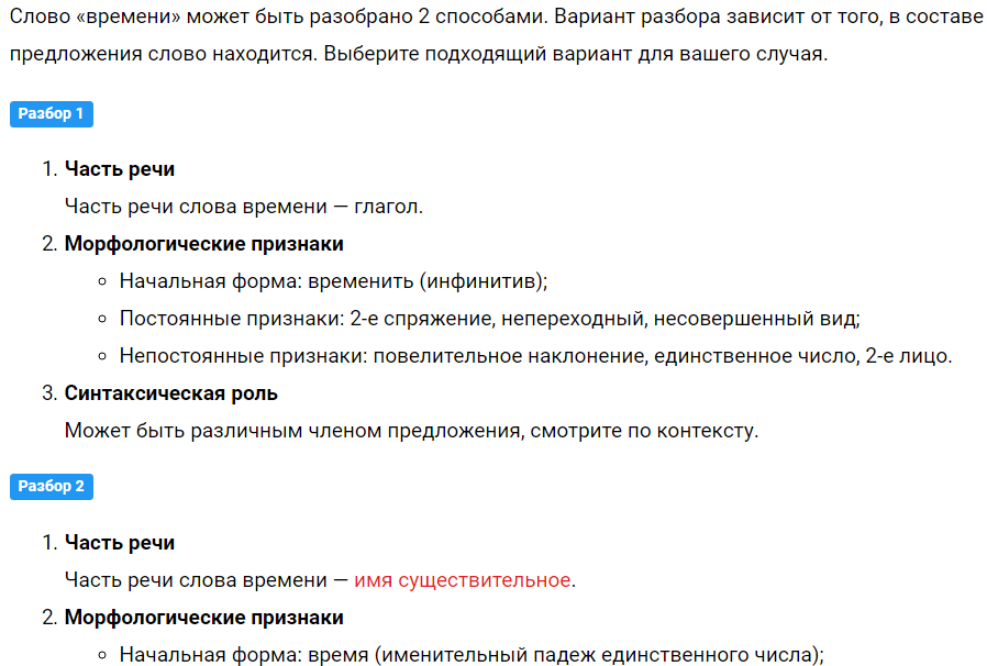 А второй строкой идут «Морфологические признаки», которые в первом сервисы обозначены как «Грамматика». Тут они прописаны лучше, так как разделены на постоянные и непостоянные. Имеется в виду, что в зависимости от формы слова, какие-то признаки могут меняться, а какие-то нет. Например, существительное «время» всегда нарицательное, неодушевленное, среднего рода и 2 склонения. Это постоянные признаки. А падеж и число могут меняться в зависимости от формы слова: «нет времени», «дай время», «с давних времен». Тут родительный, дательный, снова родительный падеж. И единственное, снова единственное и множественное число. Какую форму слова «время» употребишь, такой падеж и число и будет. Потому это непостоянные признаки.