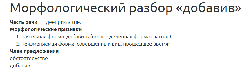 Разбор слова в ВикисловоА вот разбор слова «добавив». Тут уже однозначно указан член предложения. Это обстоятельство. Потому что деепричастия всегда являются обстоятельствами.