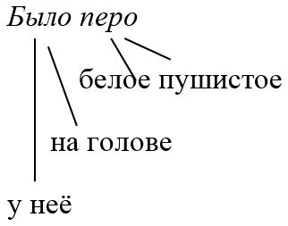 Перо (какое?) белое, пушистое, второстепенные члены относятся к подлежащему. Было (где? на чём?) на голове, второстепенный член относится к сказуемому.