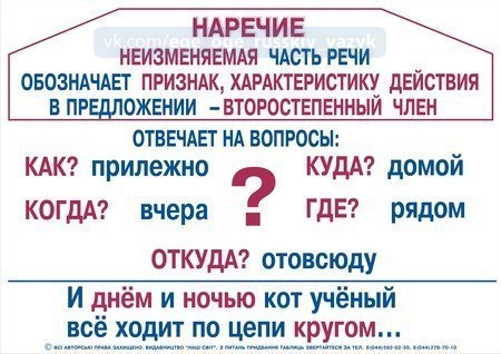 Наречие — это часть речи, которая обозначает признак действия и описывает где, когда и как это действие совершается; употребляется оно с глаголом, прилагательным или другим наречием.