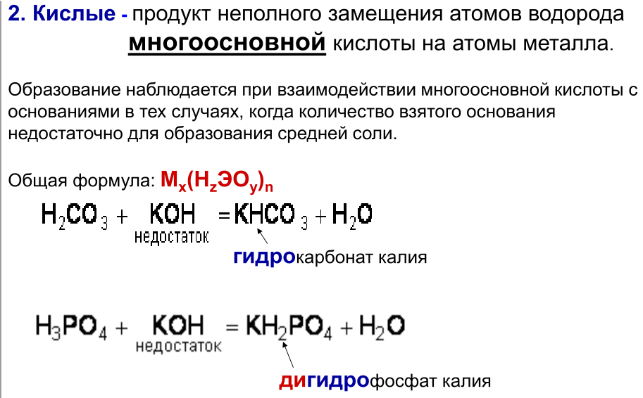 - При избытке кислоты или основания реакция нейтрализации идёт не до конца и образуются кислые или осно́вные соли, соответственно: