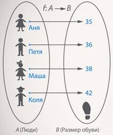 Математика создает инструменты, которые используются в различных сферах жизни. Одним из таких инструментов является функция. Вспомним, что функцией называется соответствие между двумя множествами, при котором каждому элементу одного множества ставится в соответствие единственный элемент другого множества (). Так, каждому человеку можно поставить в соответствие размер обуви, каждому дню в данной местности – среднесуточную температуру, стороне квадрата – его площадь и т. д. (см. рис. 1). Все это примеры функций.