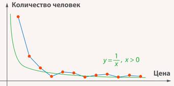 Например, можно провести опрос: сколько готовы платить родители за онлайн-обучение своего ребенка? Поставим по одной оси цену, по другой – количество согласившихся на занятия по такой цене. Отметив точки и соединив их, получим следующую кривую, которая очень похожа на график обратной пропорциональности (см. рис. 6). Что вполне логично: чем больше цена, тем меньше людей, которые готовы покупать продукт. В экономике эта кривая носит название «кривая спроса».