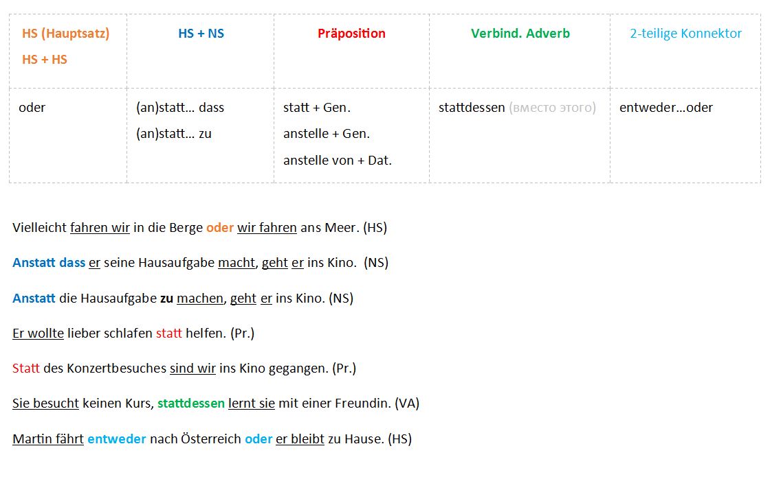 | **ungeachtet dessen, dass | Ungeachtet dessen, dass wir keine Möglichkeit haben, werden wir weiter versuchen. | Несмотря на то, что у нас нет никакой возможности, мы будем продолжать попытки.