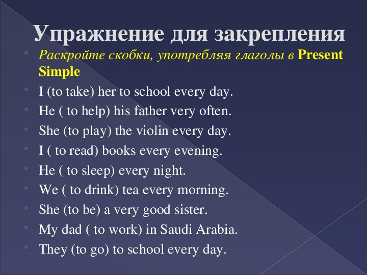 Запомните!Для образования утвердительного предложения в Present Simple используйте первую форму глагола (инфинитив) без частицы to после подлежащего (субъекта, исполняющего действие). Если подлежащее стоит в 3-ем лице ед. числа, к глаголу добавляется окончание -(e)s