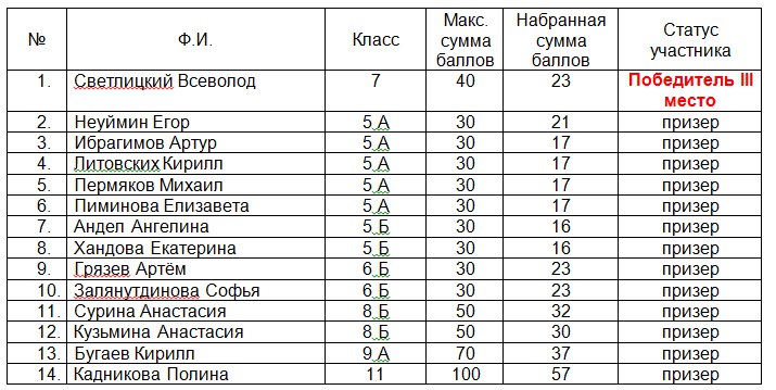Список победителей и призеров Олимпиады будет опубликован после завершения выверки персональных данных и при наличии полного комплекта документов от каждого участника (копия паспорта, оригинал справки, согласие на обработку персональных данных).