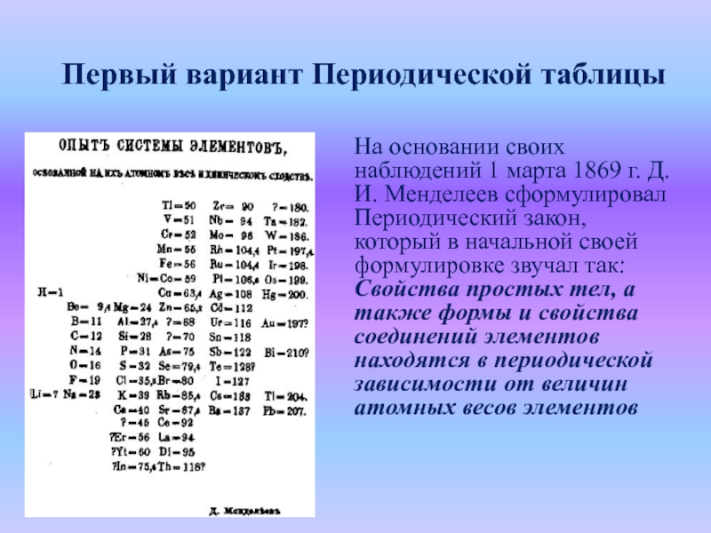 Свойства простых тел, а также формы и свойства соединений элементов находятся в периодической зависимости от величины атомных весов элементов.