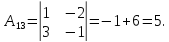 A12=(−1)1+2⋅|251−1|=7;{\displaystyle A_{12}=(-1)^{1+2}\cdot {\begin{vmatrix}2&5\\1&-1\end{vmatrix}}=7;}