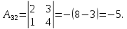 A32=(−1)3+2⋅|3−125|=−17;{\displaystyle A_{32}=(-1)^{3+2}\cdot {\begin{vmatrix}3&-1\\2&5\end{vmatrix}}=-17;}