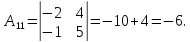 A11=(−1)1+1⋅|−157−1|=−34;{\displaystyle A_{11}=(-1)^{1+1}\cdot {\begin{vmatrix}-1&5\\7&-1\end{vmatrix}}=-34;}