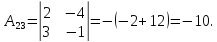 A23=(−1)2+3⋅|3217|=−19;{\displaystyle A_{23}=(-1)^{2+3}\cdot {\begin{vmatrix}3&2\\1&7\end{vmatrix}}=-19;}