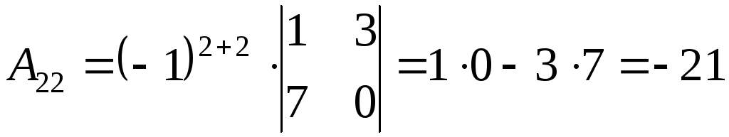 A21=(−1)2+1⋅|2−17−1|=−5;{\displaystyle A_{21}=(-1)^{2+1}\cdot {\begin{vmatrix}2&-1\\7&-1\end{vmatrix}}=-5;}
