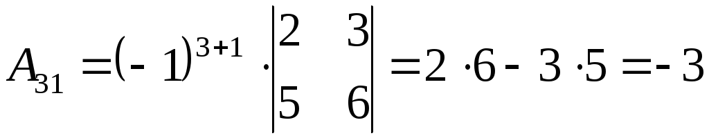 A31=(−1)3+1⋅|2−1−15|=9;{\displaystyle A_{31}=(-1)^{3+1}\cdot {\begin{vmatrix}2&-1\\-1&5\end{vmatrix}}=9;}