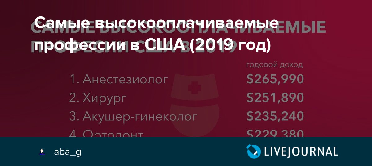 Ниже приведены 25 профессий, указанных в списке самых высокооплачиваемых вакансий 2019 года компании Glassdoor.Glassdoor ранжирует профессии по наивысшей годовой средней базовой заработной плате, определяемой собственным алгоритмом сайта, который учитывает такие факторы, как местонахождение и трудовой стаж. Чтобы попасть в этот список, на вакансии должно быть не менее 100 отчетов о заработной плате сотрудников американских компаний, составленных на Glassdoor в период с 1 июля 2018 г.