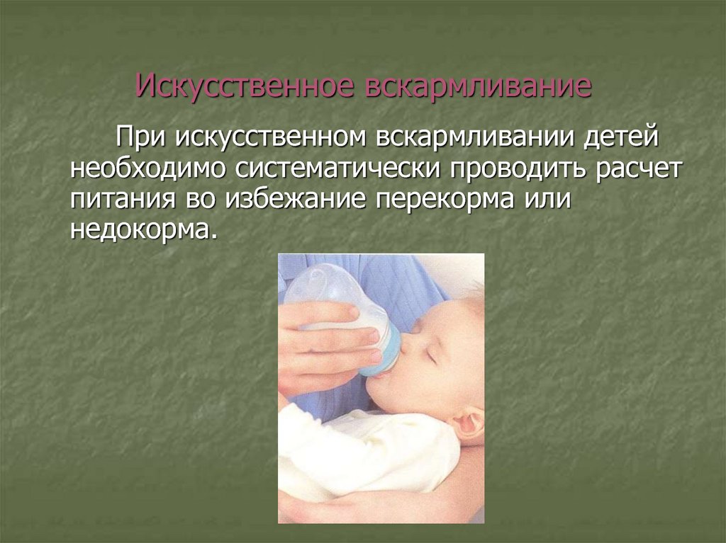 - Искусственное вскармливание предусматривает систематический расчет энергетической ценности пищи, содержания белков, жиров и углеводов при каждом его изменении в связи с тем, что на искусственном вскармливании возможно как недокармливание ребенка, так и его перекорм. Показателем пригодности смеси являются данные нормального развития ребенка.