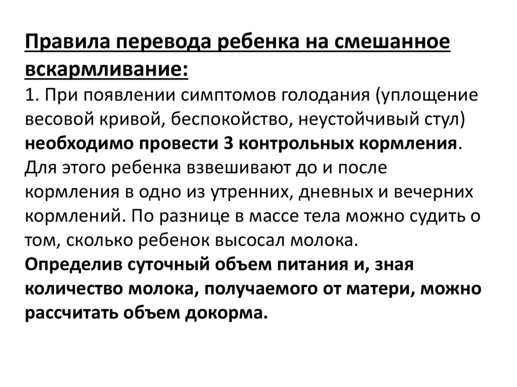 При кормлении ребенка грудным молоком в сочетании с молочными смесями важно сохранить кормление по требованию, при этом необходимо постоянно контролировать набор веса. Важно, что докорм вводится лишь после кормления грудью. Кроме того, необходимо учесть и следующие рекомендации специалистов: грудь обязательно предлагается ребенку при каждом кормлении, т.к. чередование кормлений грудью и смесью приведет к угасанию лактации. При небольшом объеме молока, ребенок при кормлении прикладывается к обеим грудям, а если докорма немного – он предлагается с ложечки, а не из бутылки.