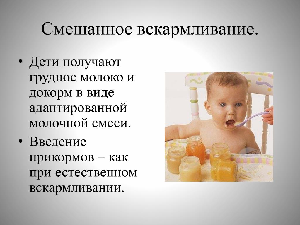 - Прикорм при смешанном вскармливании вводится на 2-3 недели раньше, чем при естественном. Для расчета потребностей ребенка в пищевых ингредиентах учитывают возраст ребенка, к какому виду вскармливания приближено питание (искусственному/естественному), вид применяемой смеси (адаптированная/неадаптированная)