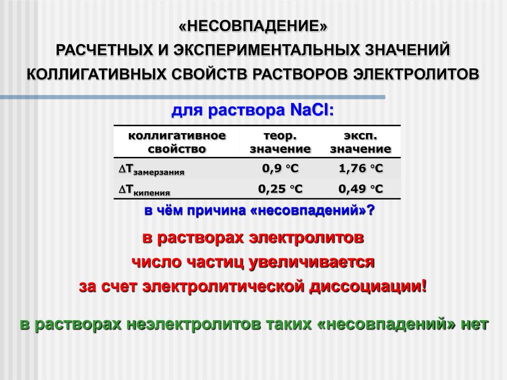 Теория электролитической диссоциации Аррениуса объяснила различие в поведении неэлектролитов и электролитов увеличением числа частиц в последних, вследствие диссоциации растворенного вещества на ионы. Этим, в частности, обусловлены более значительные изменения в электролитах свойств, связанных с понижением давления пара растворителя (понижение температуры замерзания, повышение температуры кипения растворов и др.