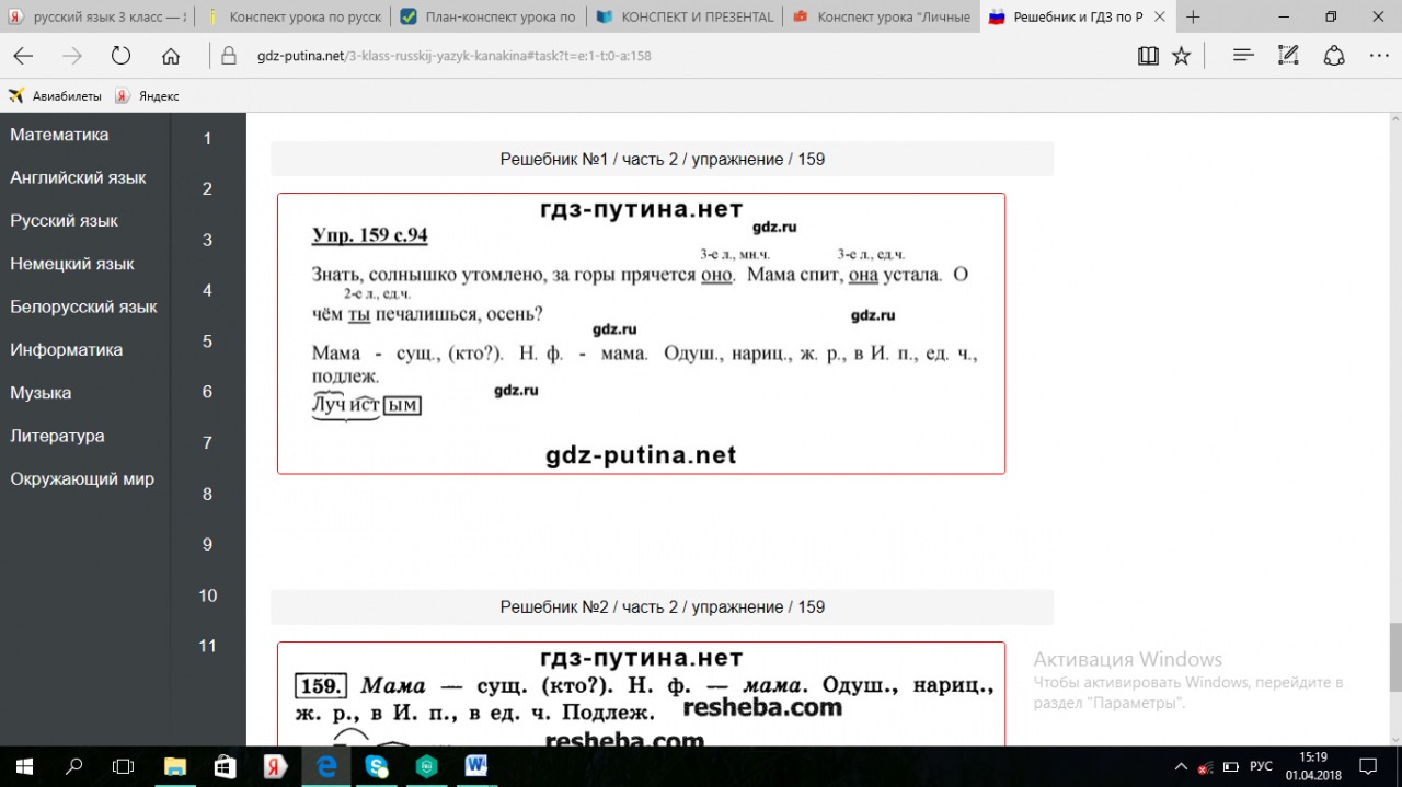 -Выполним упражнение 159.Откройте тетради, подпишите число, классная работа. Первые три предложения запишем в тетрадь.