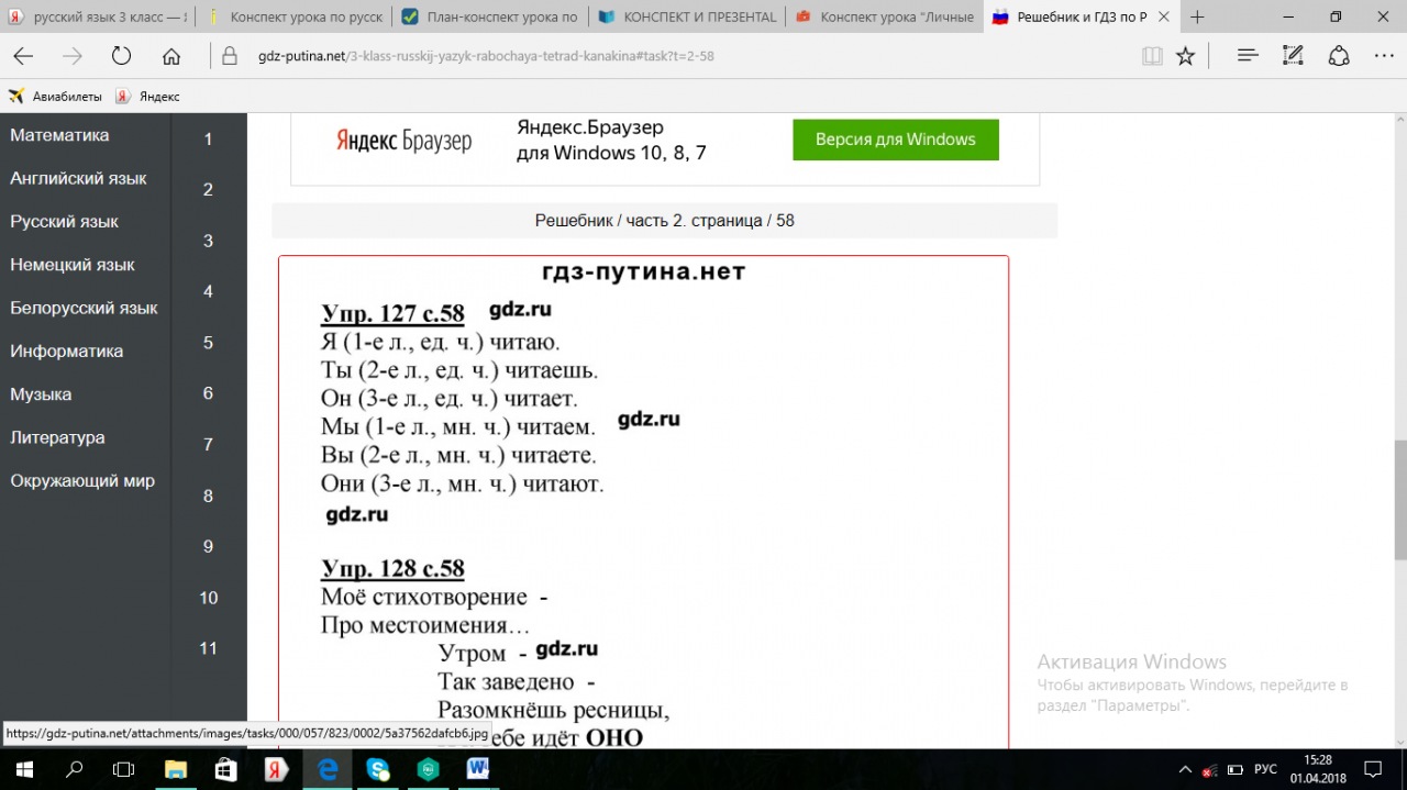 Знания (ученик будет знать): понятие о местоимении, личных местоимениях.
