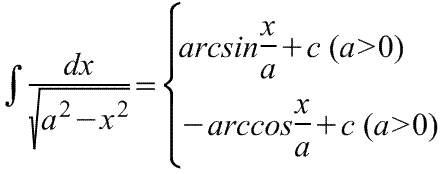 $$\int \frac{dx}{\sqrt{a^{2} — x^{2}}} = \operatorname{arcsin}\left(\frac{x}{a}\right) + C$$