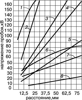 Повышение давления воздуха приводит к увеличению напряжения коронного разряда и напряженности электрического поля, при которой происходит пробой для рассматриваемой системы электродов. Согласно закону Пашена, в однородном электрическом поле напряжение пробоя не изменится, если при уменьшении межэлектродного зазора во столько же раз увеличить давление газа в зазоре. Такие распространенные газы, как азот, кислород и двуокись углерода, по своей изолирующей способности близки к воздуху при атмосферном давлении. Некоторые пары, особенно те, что содержат серу, хлор или фтор, такие, как гексафторид серы (SF6), четыреххлористый углерод (CCl4) и фреон-12 (CCl2F2), имеют втрое большую электрическую прочность, чем воздух при том же давлении. Влияние давления на напряжение пробоя для некоторых материалов показано на рисунке.