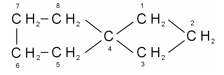 «Спиро-атом» является единственным общим членом двух колец. В зависимости от числа присутствующих спиро – атомов различают моноспиро -, диспиро – и т.д. соединения. Моноспиросоединения, имеющие два алициклических кольца, следует называть, помещая префикс «спиро» перед названием углеводорода. Число углеродных атомов, связанных со «спиро-атомом» в каждом кольце, указывают в порядке возрастания в квадратных скобках. Нумеруют цепь, начиная с атома, стоящего рядом со «спиро-атомом» в меньшем кольце, а затем через «спиро-атом» нумеруется другое кольцо (6). В циклах, имеющих ненасыщенные связи, сохраняется та же система нумерации, но в этом случае выбирается такое направление нумерации, при котором двойная и тройная связи имеют наименьшие номера.
