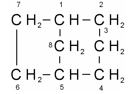 Насыщенные алициклические углеводородные системы, состоящие только из двух колец, имеющих два или больше «общихатомов », называют с добавлением префикса «бицикло» к названию общего числа атомов углерода. «Общие атомы» или «мостик» соединяет две различные части молекулы. Два третичных атома углерода, соединенных «мостиком», называются «головами моста». Число атомов углерода, соединяющих два третичных атома углерода, указывают в скобках в нисходящем порядке (7-9). Атомы нумеруют, начиная с одного из атомов в «голове мостика» по наиболее длинному из возможных путей ко второй «голове мостика», далее нумерацию продолжают по наиболее длинному пути к началу нумерации и заканчивают, следуя по наиболее короткому пути построения. Для ненасыщенных циклов сохраняется также система нумерации, но если есть возможность выбора, нумерацию начинают с того третичного атома, чтобы к положениям ненасыщенных связей присваивались наименьшие номера (9).
